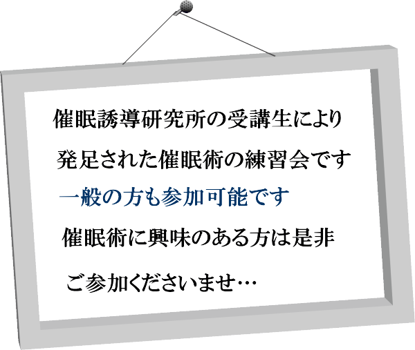 | 催眠誘導研究会は催眠誘導研究所の生徒たちで構成された非営利目的の団体です。当研究会が開催する催眠術練習会は催眠の練習を目的にされている方、催眠を体験されたい方、本物の催眠術を実際に見てみたい方など、参加された方がみなさん何かしら得るものがあり、満足していただくように努力しております。 |