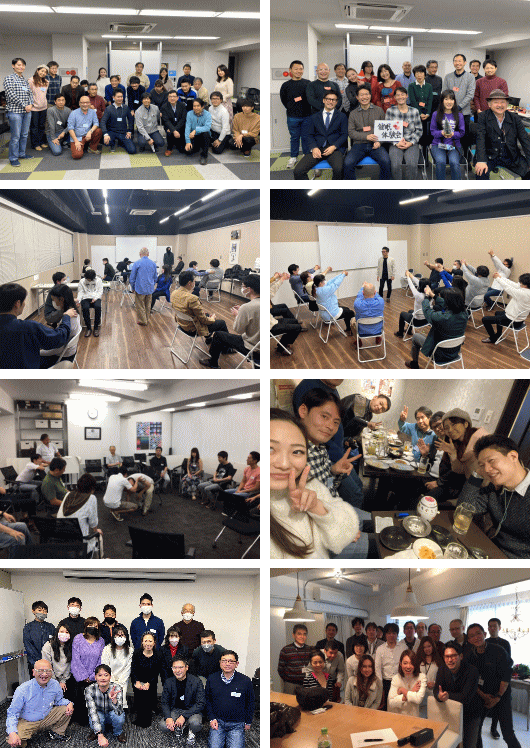 定刻になりましたら、その日の担当者が催眠にかかりやすくするためのウォーミングアップを冒頭で行います。その後、休憩をとり、誘導者と被験者がペアになり、施術を行います。途中、休憩をはさみ、メンバーのシャッフルを1回、もしくは2回行います。そして、最後はスッキリとした気持ちで帰っていただくように、日常生活での疲れを取るための浄化(心のデトックス)の催眠を行い、終了します。 |