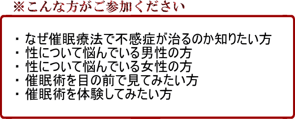 今回のイベントでは、催眠性感療法を真面目に勉強している男性陣と、女性の性について真剣に勉強している女性陣が情報交換を行い、お互いを高め合えたらと思っています。