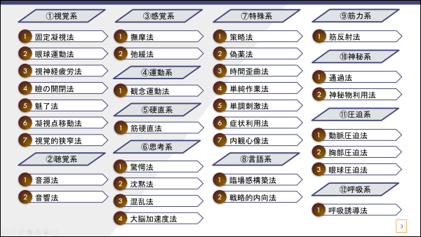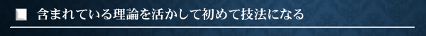 理論別に分けただけでもざっと26種類になりますが、さらに、確立している技法別に分けると62種類になります。そのひとつ一つに別々の理論が含まれており、それぞれ技法を成功させるためのコツがあります。 |