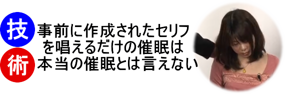 また、「催眠がかかるかどうかはかける人の能力ではなく、かかる人の能力です」などとバカなことを言っている催眠の先生たちは、催眠を台本形式で教えていて、人差し指が寄ってくるといったトリックのあと、こぶしが開かなくなるといったように、いつも同じセリフで同じことをします。そういった催眠を教えられた人が弊社の講座を受けると「私が前に習ったのは催眠風マジックの延長で、そのマジックに引っかかった人だけが催眠にかかっていたんですね…」と言ったりします。 |